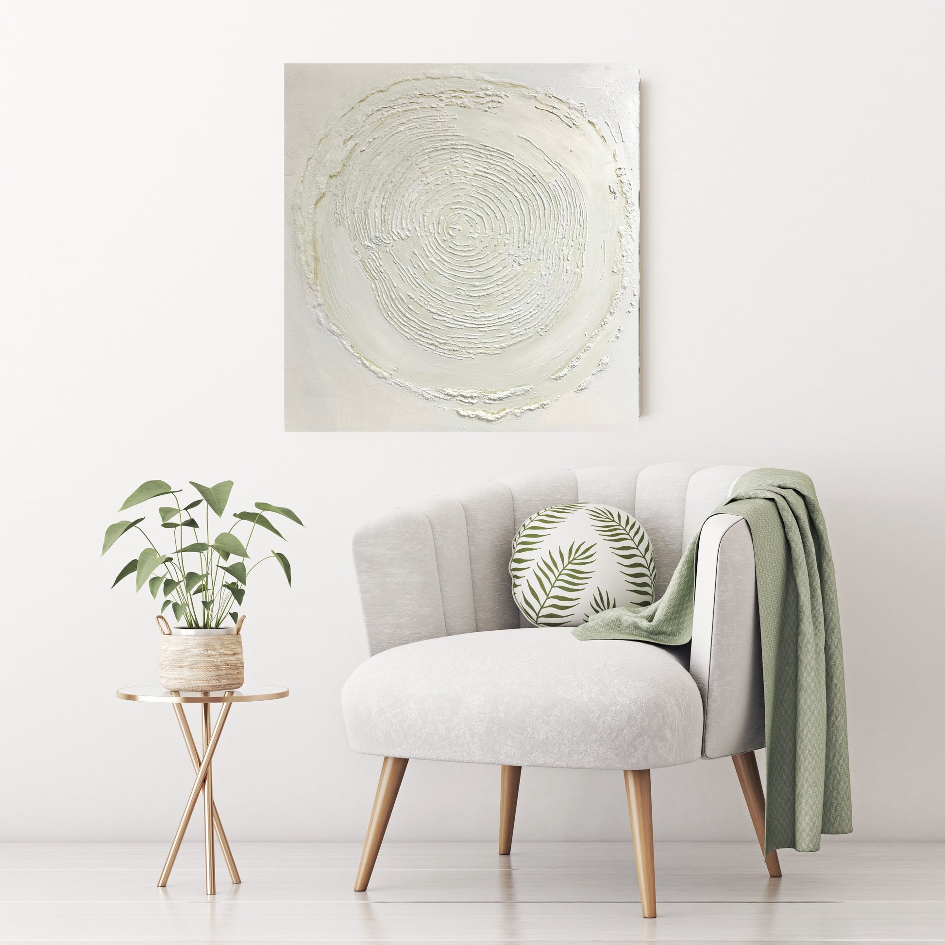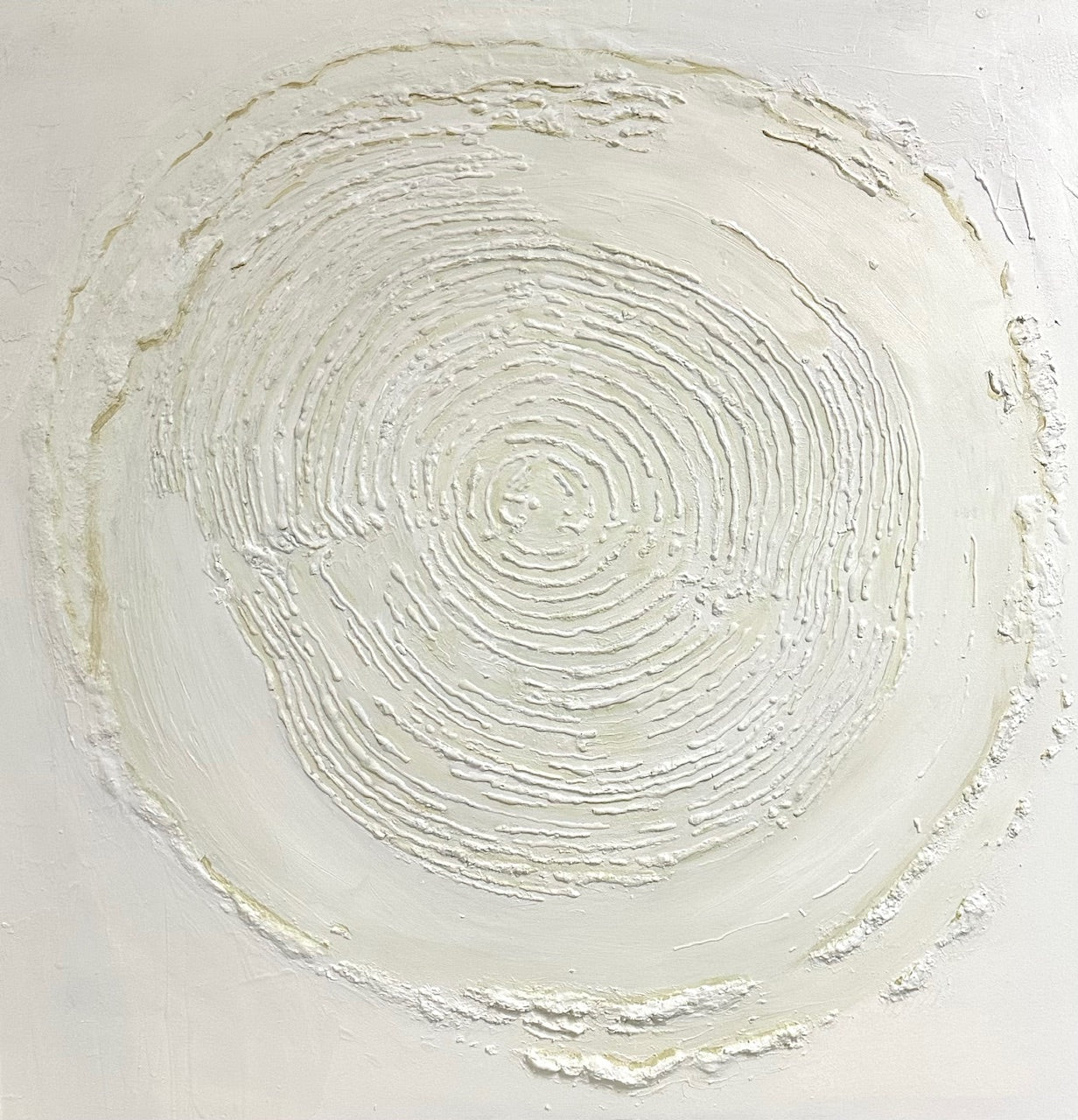 Christina and Jessie prepared the paste and carefully traced the tree ring through a projector onto the canvas. Careful with each detail and ring, they built up the rings and sealed the textured area. After several months the surface was ready to paint. I added neutral colors to enhance the shadows and separate the print from the background.