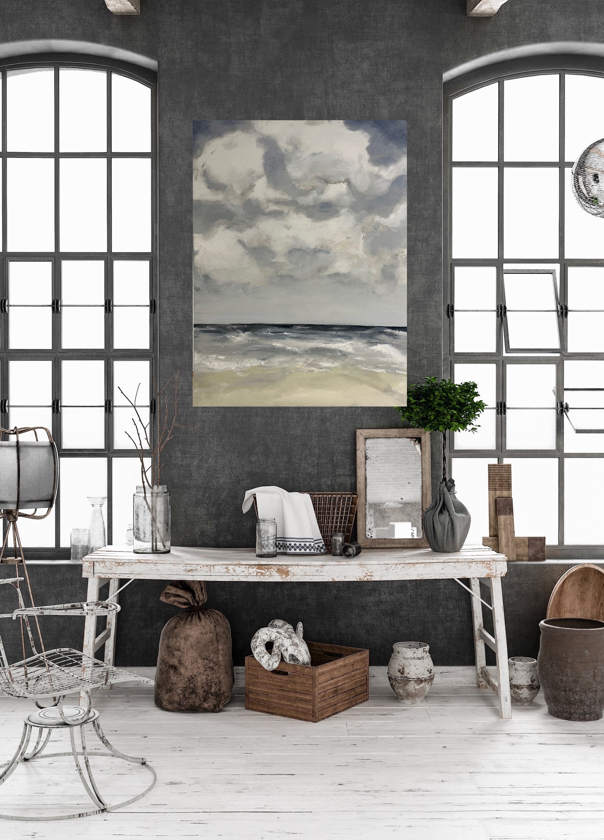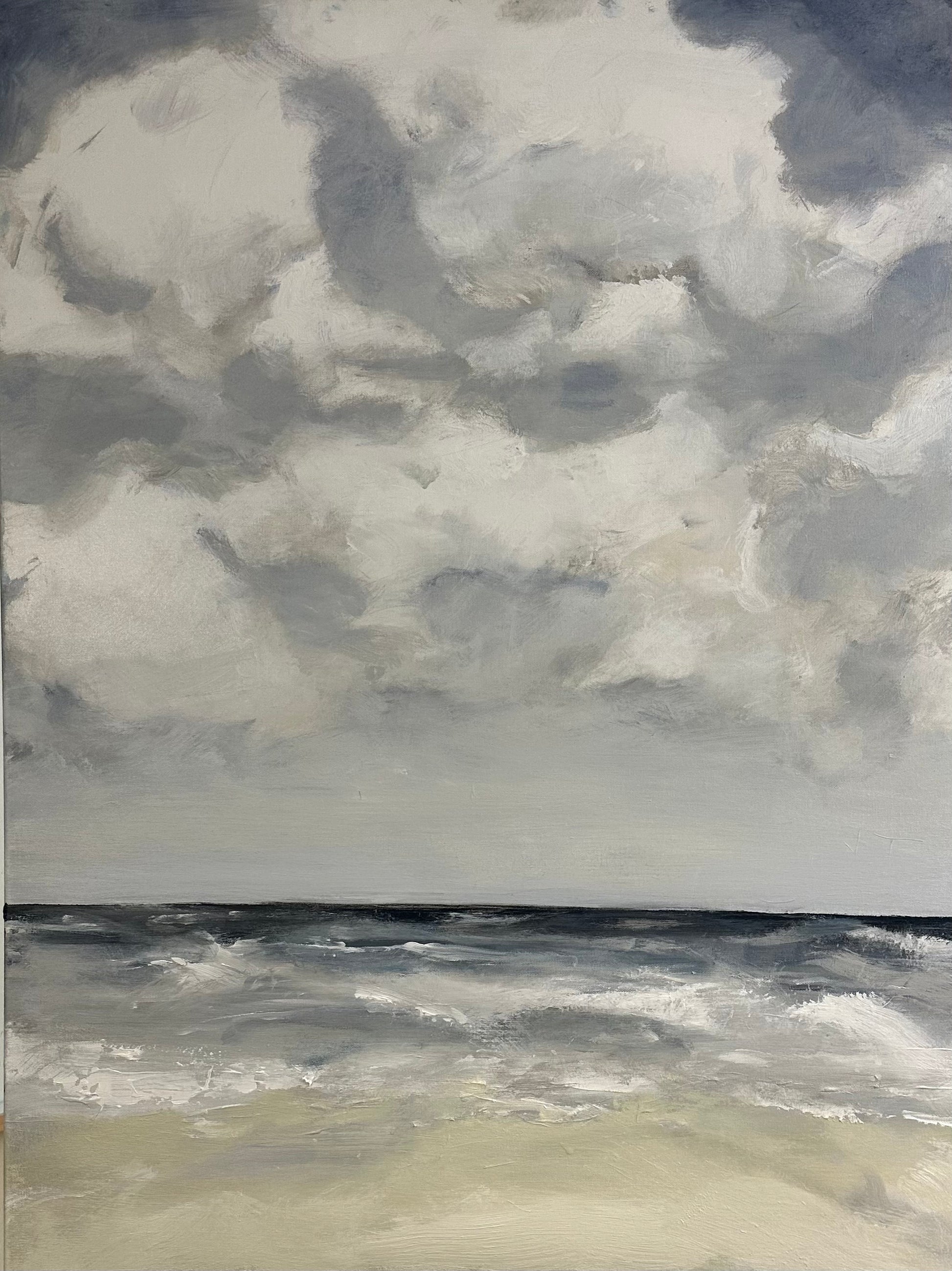 September brings the long awaited exhale of summer and churns up the sea with distant storms bringing choppy waves and massive layered skies. No longer tame, the power of the sea is set free . The sky joins in.